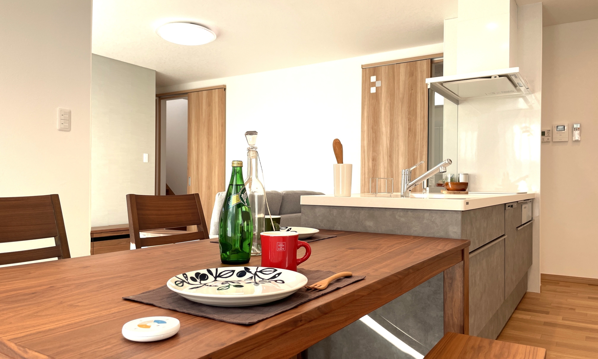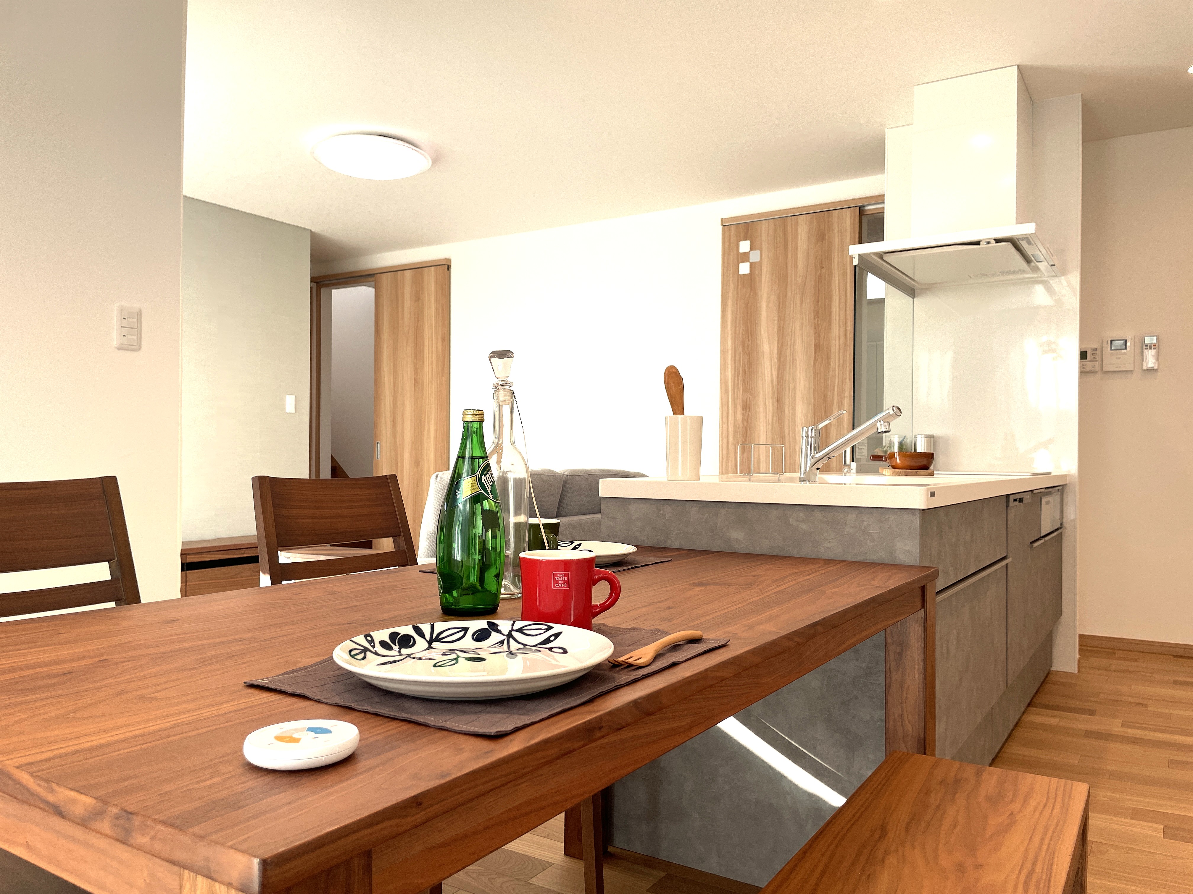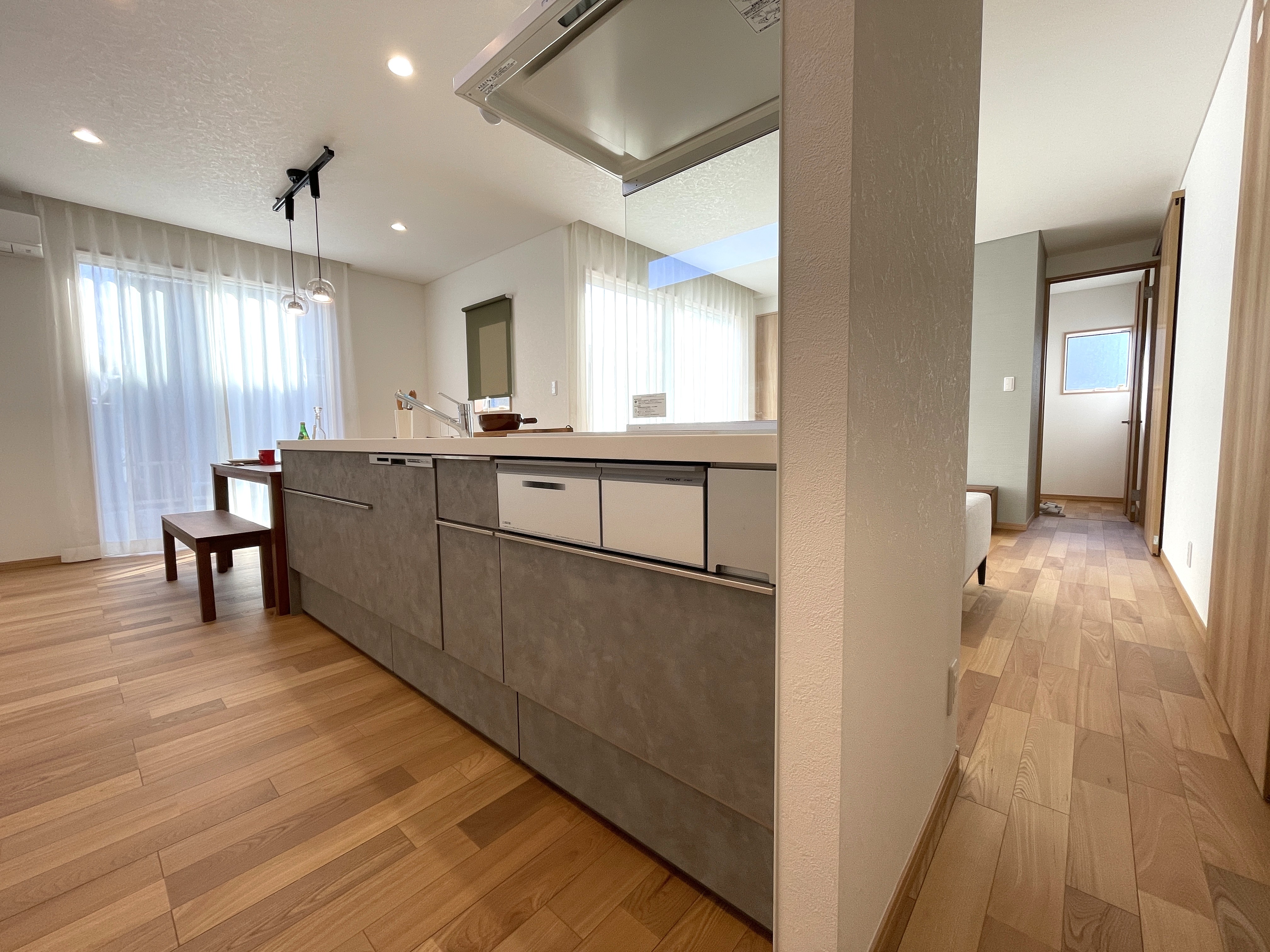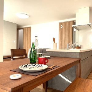 キッチンから一直線にダイニングテーブルを配し